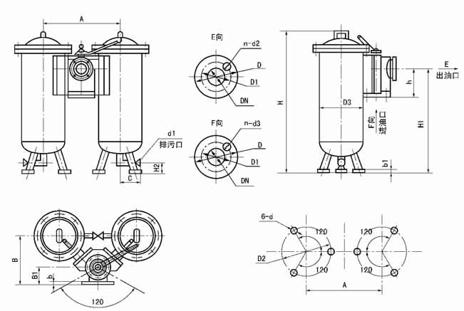 1、过滤器分别由两组过滤装置和一个六通换向阀组成,正常工作时,一组过滤装置投入运行,另一组被换向阀封闭备用。